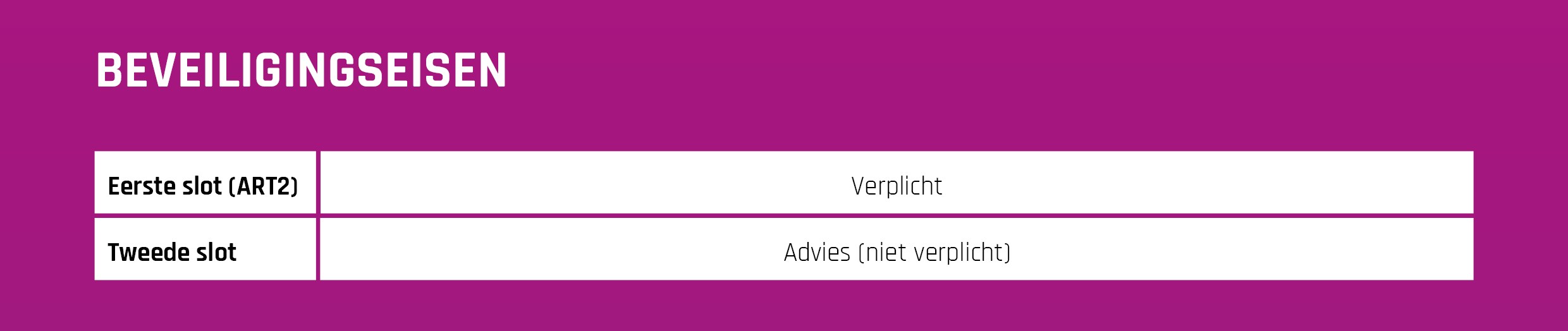 Om in aanmerking te komen voor een uitkering bij diefstal is het belangrijk dat er aan bepaalde beveiligingseisen wordt voldaan. In deze tabel vind je daar alles over terug. Meer informatie over een ART2 goedgekeurd slot? Kijk dan op www.stichtingart.nl.